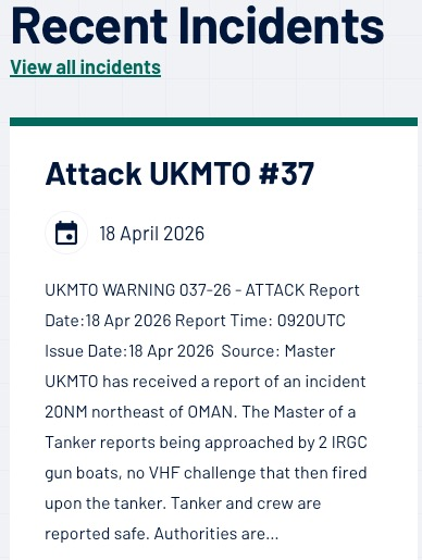 航运界网消息,当地时间4月18日,英国海上贸易行动办公室(UKMTO)发布37号通告称,在阿曼东北20海里处发生事故的报告。1艘油轮船长报告称,2艘伊朗革命卫队炮艇靠近并开火。据悉,油轮和船员安全。当局正在调查。简言之,就在伊朗军方发布声明称,因美国“背信弃义”,霍尔木兹海峡管控已恢复至此前状态后不久,UKMTO就发布了上述最新的报告。具体而言,AIS数据显示,至少2艘试图穿越霍尔木兹海峡的印度船