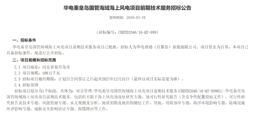 海上风电观察获悉,今日(3月18日),华电秦皇岛国管海域海上风电项目前期技术服务招标公告,项目规模:100万千瓦。招标范围:招标项目划分为1个标段,具体为:项目管理-华电秦皇岛国管海域海上风电项目前期技术服务(CHDTD204616-QT-89901):华电秦皇岛国管海域海上风电项目前期技术服务,包括但不限于海上风电预选址研究专题、预可行性研究报告(含竞争性配置投标文件)、可行性研究报告及技术专题