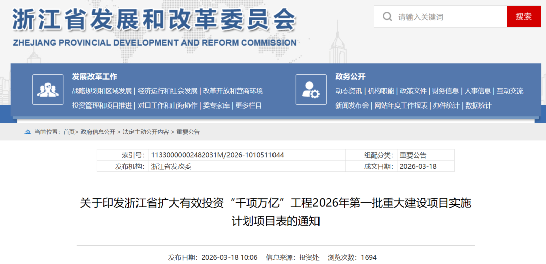 海上风电观察获悉,,3月18日,浙江省发展和改革委员会发布《关于印发浙江省扩大有效投资“千项万亿”工程2026年第一批重大建设项目实施计划项目表的通知》。根据《浙江省扩大有效投资“千项万亿”工程2026年第一批重大建设项目实施计划项目表》,风电类项目共10个,包括8个海上风电项目(总装机容量达3480MW)、1个全省风电项目打包以及1个深远海风电母港工程。具体如下:玉环2号海上风电项目:项目业主为