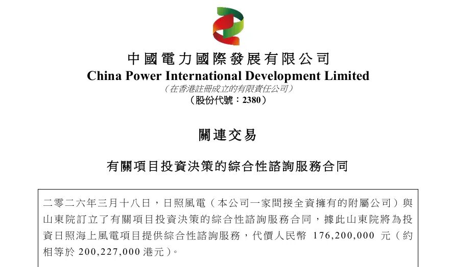 海上风电观察获悉,3月18日,中国电力国际发展有限公司(以下简称“中国电力”或“公司”)发布《有关项目投资决策的综合性咨询服务合同》。公告披露,2026年3月18日,中国电力间接全资拥有的附属公司国电投(日照)海上风电有限公司(以下简称“日照风电”)与山东电力工程咨询院有限公司(以下简称“山东院”)订立有关项目投资决策的综合性咨询服务合同,山东院将为日照海上风电项目提供综合性咨询服务,代价人民币1