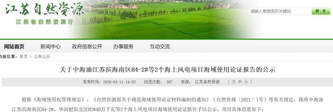 海上风电观察获悉,近日,江苏省自然资源厅发布《关于中海油江苏滨海南区H4-2#等2个海上风电项目海域使用论证报告的公示》。中海油江苏滨海南区H4-2#海上风电项目根据公示,中海油江苏滨海南区H4-2#海上风电项目位于滨海县近海海域。风电场场区大致呈三角形,中心离岸约39km,风电场外包络线离岸最近距离为30.2km,场区实测水深在17~18m之间(1985国家高程基准),规划海域面积约48km²。