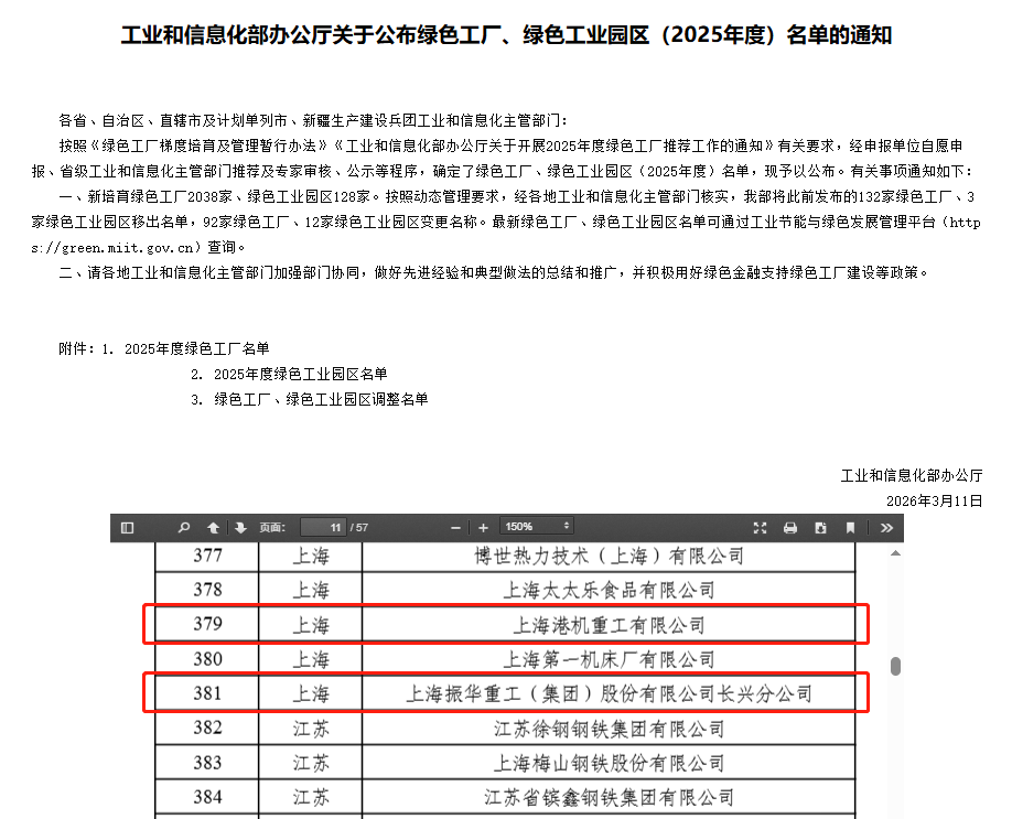 3月18日,工业和信息化部公布绿色工厂、绿色工业园区(2025年)名单,公司所属港机重工、振华长兴分公司、振华海工三家单位成功获评“绿色工厂”,标志着“零碳振华”建设取得重要成果。上海振华重工集团认真落实国家“双碳”战略,加快推进公司绿色化发展,全面建设绿色工厂。本次获评的三家单位按照“能源低碳化、资源高效化、生产洁净化、产品绿色化、用地集约化”核心理念,全面落实实施绿色转型工作举措,取得了较好成