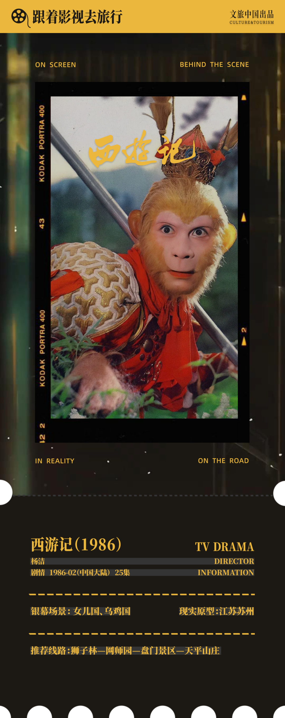 编者按:一屏光影,万里山河。当前,文化和旅游部深化文旅融合发展,将“跟着影视去旅行”作为创新业态、扩容消费的重要抓手,解锁文旅新体验、释放消费新潜能,更好满足群众美好生活向往。因一部影视、赴一座城,已成大众出行新风尚。为此,文旅中国特别策划“跟着影视去旅行”专题,以镜头为引赴山河之约,以旅行为笔绘人间四时,于光影流转间,漫步诗意中国。(序)什么样的电视剧可以被称为“国民神剧”呢?1986版《西游记