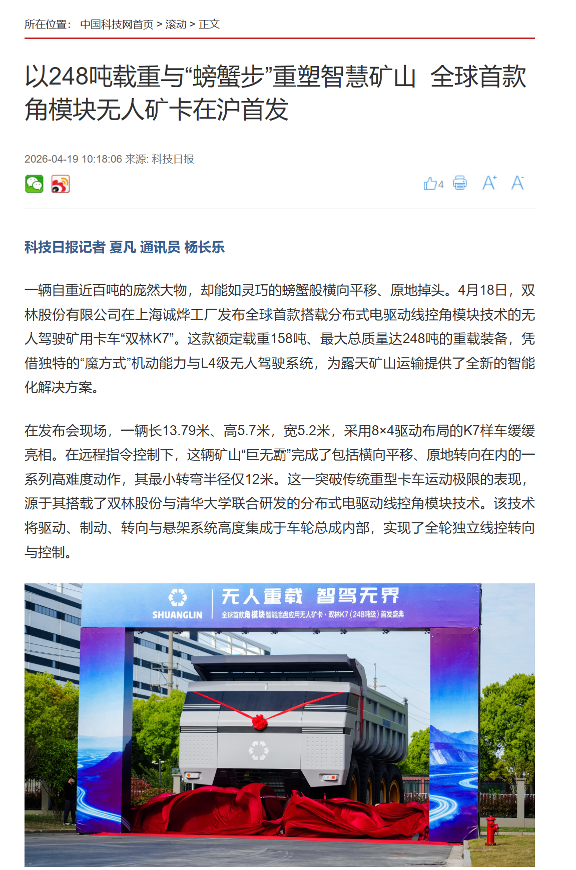 IT之家 4 月 19 日消息,据《科技日报》今天报道,双林今天在上海发布全球首款搭载分布式电驱动线控角模块技术的无人驾驶矿用卡车“双林 K7”,支持 L4 级无人驾驶,为露天矿山运输提供全新智能化解决方案。IT之家从报道中了解到,该车长宽高分别为 13.79*5.7*5.2m,额定载重 158 吨,最大总质量达 248 吨,采用 8x4 驱动布局,搭载与清华大学联合研发的分布式电驱动线控角模块技