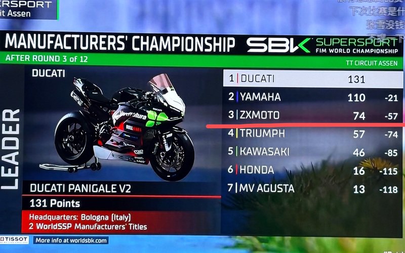 新京报贝壳财经讯(记者林子)4月19日,在提前结束的世界超级摩托车锦标赛(WSBK)2026荷兰站第二回合正赛中,中国摩托车品牌张雪机车的53号车手瓦伦丁·德比斯驾驶820RR-RS,取得第七名成绩。截至目前,在WSBK制造商积分榜上,张雪机车的总积分位列第三名,仅落后于杜卡迪和雅马哈。4月19日的阿森纳赛道,天下着小雨。直播解说员说,目前所有车手只有干燥路面的数据,由于出现了小雨,需要看车手的现
