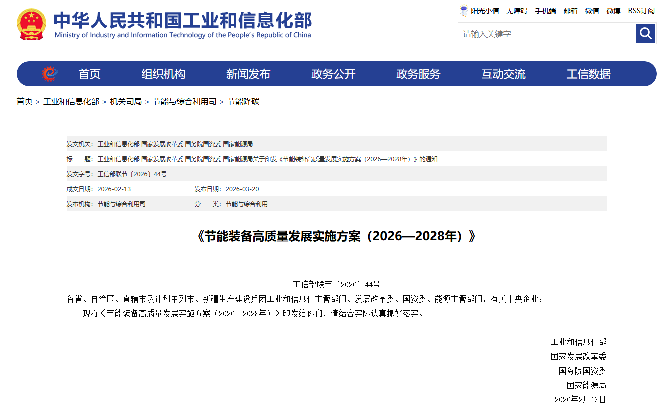 3月20日,工业和信息化部、国家发展改革委、国务院国资委、国家能源局等四部门联合印发《节能装备高质量发展实施方案(2026—2028年)》(工信部联节〔2026〕44号,以下简称《实施方案》),持续提升通用性强、用能量大、发展前景突出的节能装备能效水平,加强节能装备供给与应用。 《实施方案》聚焦节能电机、变压器、工业热泵、工业制冷(热)与加热设备、水电解制氢装备、信息通信设备等六类节能装备,提出以