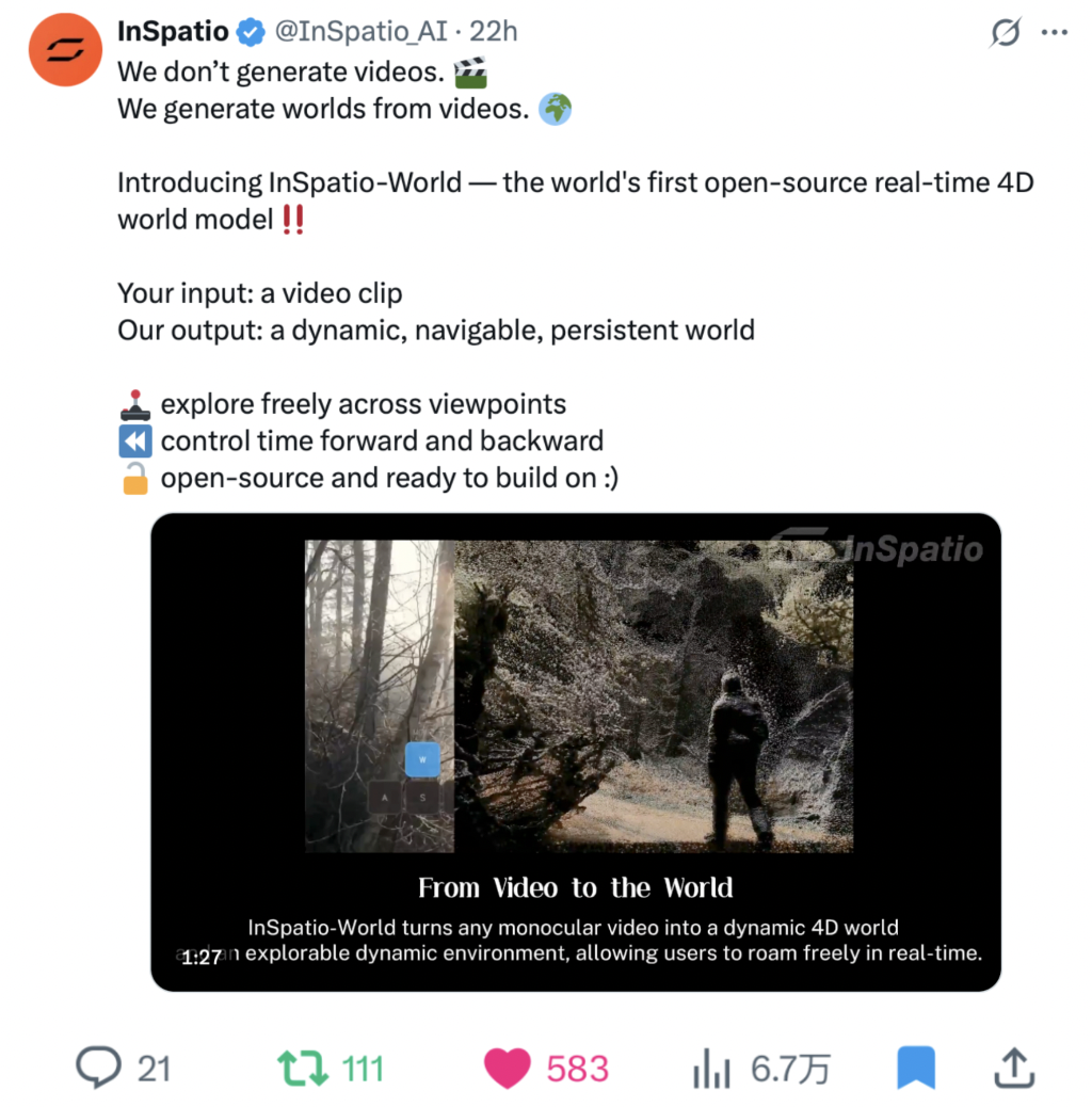 正是这种从实验室到产业端的双向奔赴 —— 学术研究提供「从 0 到 1」的范式突破,工程化能力承接「从 1 到 N」的效率攻坚 —— 让影溯不仅理解如何构建静态空间,更理解如何让空间逻辑化地动态演化。基于这种从「模拟像素」到「模拟存在」的范式理解,影溯在两周内连续凭借 InSpatio-WorldFM 与 InSpatio-World 获得了广泛关注。