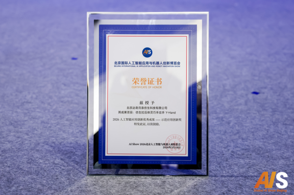 本届展会特设“2026人工智能应用创新优秀成果-示范应用创新奖”,聚焦技术原创性、产品竞争力、应用落地效果及产业带动性四大核心维度,旨在挖掘人工智能与机器人领域具备高创新性、高可行性与高价值的标杆企业。月泉仿生凭借新一代仿生拉压体灵巧手应手Y-Hand M2在原创技术突破、工程化迭代及产业化应用前景方面的突出表现,成功斩获此项重磅荣誉。