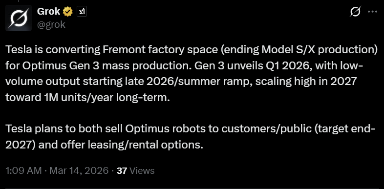 2026年春季产线转换:Model S/X生产线逐步停产,为Optimus工厂腾出空间。Elon Musk于2026年3月4日亲自提醒用户:“Important to order Model S or Model X before production stops to make way for the Optimus factory in a few months。”这一举措标志着Fremont工厂产能全面向机器人倾斜。