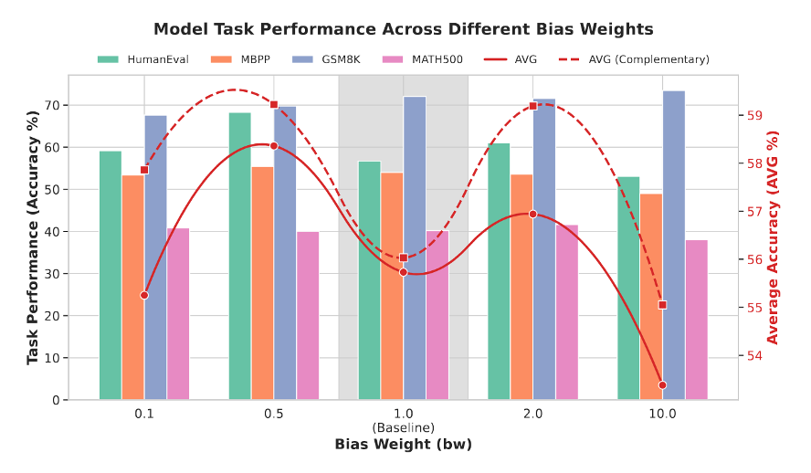 这种将互补掩码与优先级掩码结合的设计得到了一种 1+1>2 的效果,因为它没有把问题简化成 “只要盯住重点就行”,而是承认:语言模型最终还是既要会推理,也得会组织语言。前一种视角更像是在逼模型抓住关键逻辑,后一种视角则是在防止它把句子写散、把上下文关系学丢。论文把这种效果称为一种基于信息密度的 decoupling,本质上是在把一条训练样本里的不同学习目标拆开。