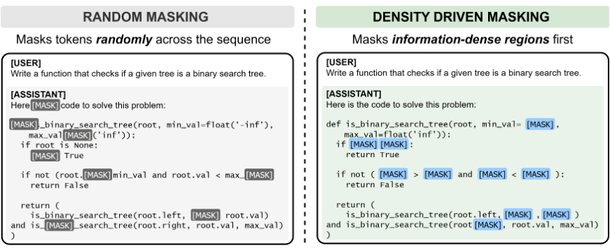 这个问题在一般文本里可能还没那么明显,但到了代码和数学推理任务上,就会变得很突出。因为这类数据里,真正决定模型能不能做对的,往往只是少数几个关键位置:在代码任务里,可能是关键的分支条件、判断逻辑;在数学里,可能是关键的化简步骤、函数替换,这些东西显然比连接词或者格式内容更重要。事实上,真实序列里的信息密度本来就不是均匀分布的,而传统随机 masking 却默认每个位置都差不多,这会被动地让模型把不少优化资源花在不那么关键的地方。