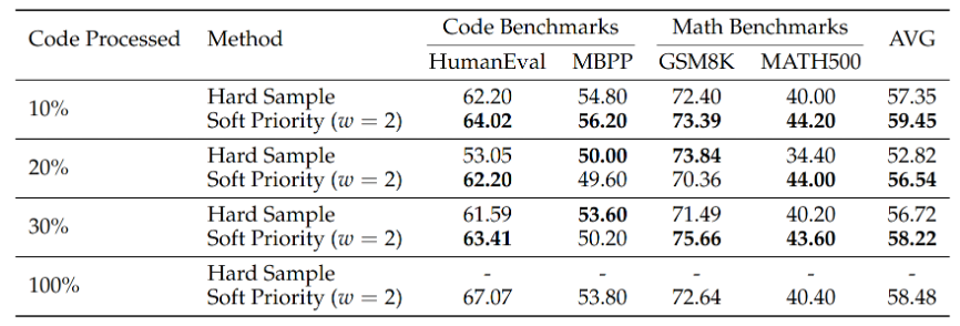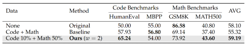 作者没有要求对全部训练数据都做离线的信息密度提取,而是做了不同比例的数据实验。结果显示,只对 10% 的代码数据做这一步处理,就已经能把平均成绩从 55.32 拉到 59.45。再继续往上加到 30%,甚至加到 100%,性能提升会逐渐趋于饱和;到了 100% 时,虽然代码类指标还能冲高,但数学推理表现反而会掉下来。论文把这种现象归因于 domain shift:代码侧结构先验加得太多,反而挤占了模型在其他推理任务上的泛化空间。