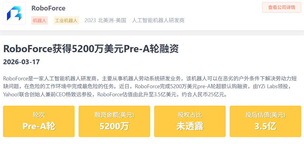 近日,硅谷具身智能赛道再传重磅消息:由物理AI驱动的RoboForce完成5200 万美元 Pre‑A 轮融资,本轮融资实现超额认购,公司投后估值达3.5 亿美元,折合人民币约25 亿元。