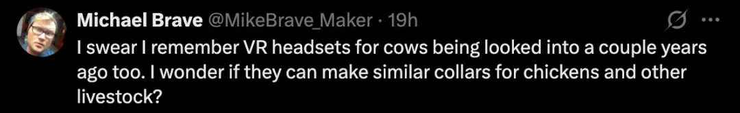 「记得几年前也有人研究过给牛用 VR 头显,不知道他们能不能也给鸡和其他牲畜做类似的项圈。」
