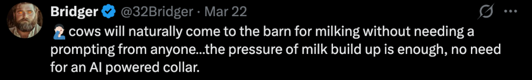 「奶牛无需任何人催促,自然就会到牛棚挤奶…… 牛奶积聚的压力就足够了,不需要人工智能项圈。」