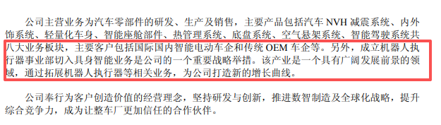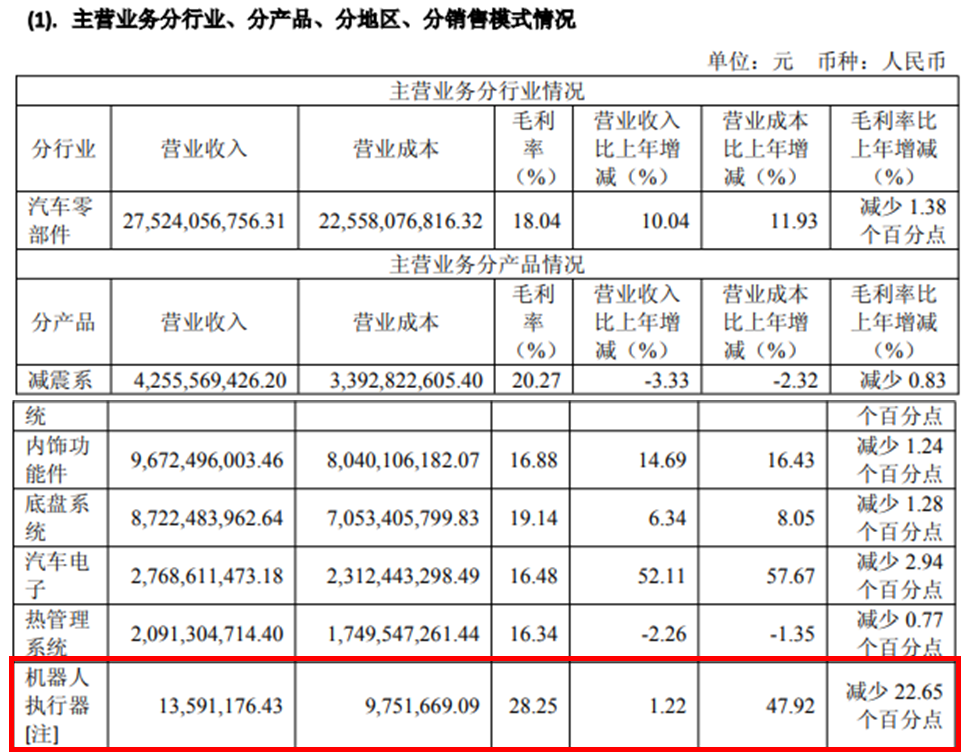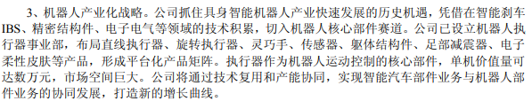 温馨提示:扫描文末二维码,加入知识星球,免费下载2700+行业报告(包含海外投行报告);商务和研究咨询合作请联系16620948826(同微信)2025年公司实现营业收入295.81亿元,同比增长11.21%,主要系国内外优质客户订单放量,Tier0.5合作模式深化,单车配套金额提升,同时海外基地产能逐步释放,国际市场份额扩大。归属于上市公司股东的净利润27.79亿元,同比下降7.38%;扣非净利润26.11亿元,同比下降4.30%。盈利下滑主要受原材料价格波动、新建工厂初期成本较高、研发投入增加等因素影响。公司目前已获得T关节总成、灵巧手核心模块、结构件和包覆件订单,单人ASP高达76万元。自去年T订单调整以来,公司交付表现稳定,获得客户高度好评。战略层面,另外,成立机器人执行器事业部切入具身智能业务是公司的一个重要战略举措。该产业是一个具有广阔发展前景的领域,通过拓展机器人执行器等相关业务,为公司打造新的增长曲线。在科技飞速发展的当下,机器人具身智能发展迅速,成为推动各行业变革的新兴力量。2025年,具身智能首次被写入《政府工作报告》,预示着其将在未来产业发展中占据重要地位,是当今社会最具发展潜力新兴产业之一,可广阔应用于智能制造、医疗、服务等各种场景,实现对劳动力的解放从而提升人类生活质量。根据机构预测,未来全球约数亿人的岗位将被机器人替代,全球机器人行业容量可达百万亿元级别,市场空间巨大,是新质生产力的典型代表之一。在AI等前沿科技快速发展及人口老龄化的大背景下,机器人产业迎来快速发展期。公司研发线控刹车系统 IBS 项目多年,在机械、减速机构、电机、电控、软件等领域形成了深厚的技术积淀,并且横向拓展至热管理系统、线控转向系统、空气悬架系统、智能座舱执行器以及机器人电驱执行器等业务。机器人执行器是机器人的核心部件,主要包括直线执行器和旋转执行器两类,为模拟人类各种运动的协调性与多自由度灵活性,需要同时满足轻量化、小型化及低功耗的技术指标,机器人执行器需要突破很多工程设计极限,实现各类电机、减速机构、传感器、编码器、驱动器、控制器的优化集成及通讯,因此结构复杂、技术非常密集。公司在机器人执行器业务的核心优势包括:1、具备永磁伺服电机、无框电机等各类电机的自研能力;2、具备整合电机、减速机构、控制器的经验;3、具备精密机械加工能力;4、具备各类研发资源及测试资源的协同能力。综上,公司在该领域具备较强的竞争力,为公司获得较大市场份额提供保障。 公司与客户的合作始于直线执行器,凭借在 IBS 领域深厚的研发积淀,产品在迅速获得客户认可后,公司顺势延伸至旋转执行器及灵巧手电机等核心部件的研发,并已完成多轮送样,项目进展迅速。在此基础上,公司横向拓展至机器人躯体结构件、传感器、足部减震器及电子柔性皮肤等关键领域,加速构建全覆盖的机器人业务平台化产品矩阵。为模拟人类运动,每台机器人需要数十个运动执行器,单机价值约数万元人民币,市场空间巨大。为抓住机器人业务的发展机遇,公司已拆分设立机器人执行器事业部,建立独立管理架构,配置优秀专业团队,同时整合各项优势资源,实现业务聚焦,为该项业务快速发展提供战略保障。此举亦是公司战略动态调整和贯彻的体现。 公司在发展智能电动汽车八大产品线的同时,抓住机器人产业快速发展的历史机遇,聚焦并不断拓展机器人产业链关键产品和核心技术,实现智能汽车部件业务与机器人部件业务的协同发展,为公司保持快速发展奠定基础。机器人执行器收入1359万元,毛利率28.25%,营收同比增长1.22%,但毛利大幅降低。但并未披露机器人执行器具体的产量和销量。公司与宁波经济技术开发区管理委员会签署了《机器人电驱系统研发生产基地项目投资协议书》。公司拟投资50亿元人民币,规划用地300亩,在宁波经济技术开发区建设机器人核心部件生产基地。机器人产业化战略。公司抓住具身智能机器人产业快速发展的历史机遇,凭借在智能刹车IBS、精密结构件、电子电气等领域的技术积累,切入机器人核心部件赛道。公司已设立机器人执行器事业部,布局直线执行器、旋转执行器、灵巧手、传感器、躯体结构件、足部减震器、电子柔性皮肤等产品,形成平台化产品矩阵。执行器作为机器人运动控制的核心部件,单机价值量可达数万元,市场空间巨大。公司将通过技术复用和产能协同,实现智能汽车部件业务与机器人部件业务的协同发展,打造新的增长曲线。免责声明