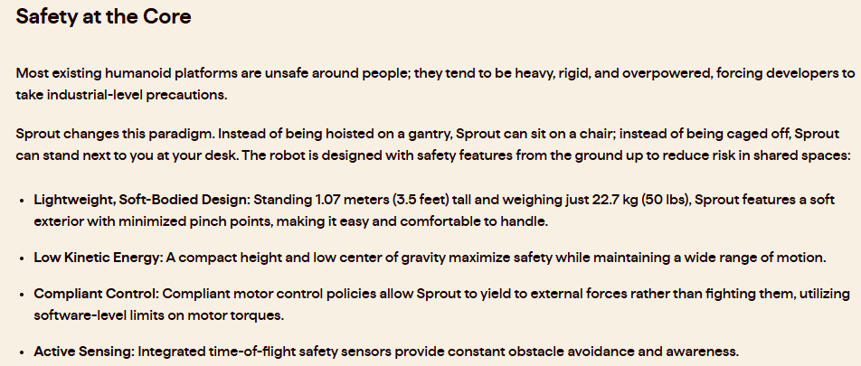 温馨提示:扫描文末二维码,加入知识星球,免费下载2700+行业报告(包含海外投行报告);商务和研究咨询合作请联系16620948826(同微信)根据彭博社和多家媒体消息,亚马逊公司将收购位于纽约的人形机器人开发商Fauna Robotics Inc.,亚马逊发言人证实了这一消息。Fauna的约50名员工,包括其创始人罗伯·科克伦和乔什·梅雷尔,都将加入亚马逊。Fauna Robotics 公司的 Sprout 人形机器人体积小、重量轻、触感柔软,因此比一般人形机器人更安全。Fauna目前提供Sprout,这是一款用于研究的人形机器人,于今年早些时候发布。亚马逊表示,它正采取“深思熟虑且审慎的方法,以真正了解个人机器人的潜力”。亚马逊发言人表示 : “我们对Fauna的愿景感到非常兴奋,即为所有人打造功能强大、安全可靠且充满乐趣的机器人。 凭借亚马逊在机器人领域的专业知识以及数十年来通过零售和设备业务赢得消费者信任的经验,我们期待着创造出让客户生活更美好、更轻松的新方法。”此次交易的财务细节尚未披露。今后,Fauna 将被称为“Fauna,一家亚马逊公司”。这家初创公司将加入亚马逊的个人机器人事业部。亚马逊长期以来一直投资于仓库机器人技术,包括 2012 年以 7.75 亿美元收购Kiva Systems,并且上周表示已收购瑞士配送机器人公司Rivr。RIVR 是一家开发用于送货上门的四足机器人的公司。这项交易进一步推动了亚马逊进军竞争激烈的类人机器人领域,该领域还包括特斯拉的Optimus以及Figure AI和Agility Robotics等初创公司。Sprout是一款小型轻便的人形机器人,专为科研而设计。但它并非家用机器人,不能帮助普通人做家务。根据其官网的描述,现有的大多数人形平台在人周围都不安全;它们往往很重、很僵硬、功能过强,迫使开发人员采取工业级别的预防措施。Sprout 改变了这种模式。它无需吊装在龙门架上,可以坐在椅子上。无需被关在笼子里,可以站在你的办公桌旁。这款机器人从一开始就融入了安全功能,旨在降低共享空间中的风险:轻巧柔软的设计: Sprout 高 1.07 米(3.5 英尺),重仅 22.7 公斤(50 磅),采用柔软的外壳,最大限度地减少了夹手点,使其易于操控且舒适。低动能:紧凑的高度和低重心设计最大限度地提高了安全性,同时保持了较大的活动范围。顺应性控制:顺应性电机控制策略使 Sprout 能够顺应外部作用力而不是与之对抗,它通过软件层面限制电机扭矩来实现这一目标。主动感知:集成飞行时间安全传感器提供持续的避障和感知能力。Fauna 将 Sprout 定位为“现代化的机器人开发平台”。虽然它内置了运动、控制和社交行为功能,但用户仍需自行开发应用程序。Cochran今年早些时候表示,Fauna 希望通过该平台为用户提供构建有趣应用程序所需的工具。亚马逊表示,“渴望从创作者社区使用Sprout的过程中学习,Fauna也将继续像现在一样寻求新的业务。” 然而,目前尚不清楚亚马逊未来将如何发展Fauna。该公司是否希望将Sprout打造成一款商业化的家用机器人?或者,它是否会借鉴Fauna机器人技术的经验来打造自己的类人机器人或家用机器人?Sprout 的安全至上设计理念尤其可能引起亚马逊的兴趣。Fauna 将这款机器人设计得轻巧、外壳柔软,并最大限度地减少了夹伤点。这些特性在工业用途的人形机器人中并不常见。Fauna 表示,迪士尼和现代汽车旗下的波士顿动力公司已成为其早期客户。到目前为止,亚马逊在家用机器人领域并不太走运。该公司此前发布了Amazon Astro,这是一款小型机器人,设计用途包括家庭或小型企业安全监控、远程照护年迈亲属或作为虚拟助手。然而,自2021年发布以来,Astro并未获得太多市场认可。亚马逊也因反垄断方面的担忧而取消了原定于 2024 年收购机器人吸尘器制造商iRobot的计划。资料来源:therobotreport及网络公开资料免责声明