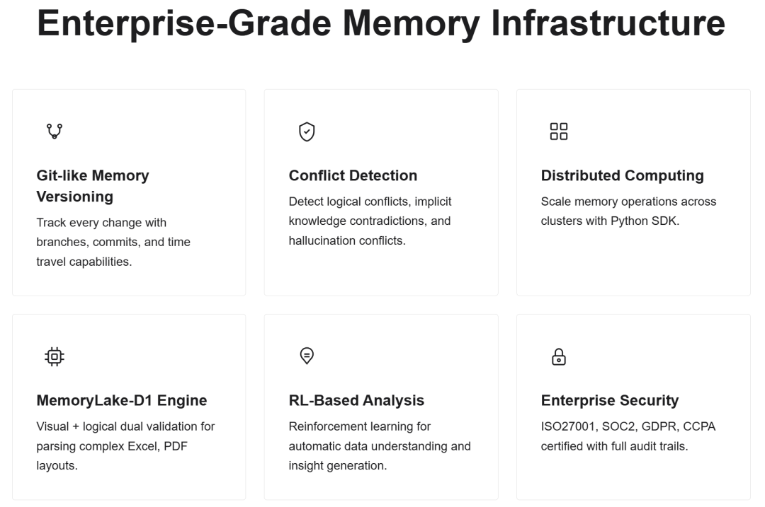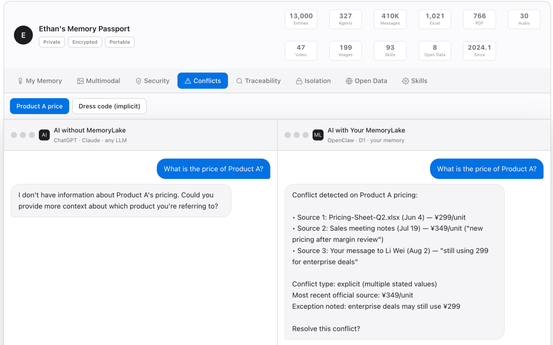 当来自不同来源或不同时期的记忆相互矛盾时,MemoryLake 会自动检测、标记并解决冲突,同时保留完整的审计轨迹。