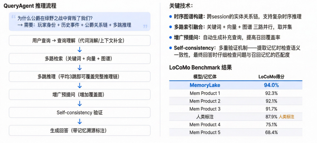 在全球极具挑战性的长程对话记忆基准测试 LoCoMo 上(需在平均 300 轮、跨数月、多模态内容的超长对话中进行精准信息整合与推理),MemoryLake 以 94.03% 的综合得分位列全球第一,显著超越其他记忆方案及人类标注基线。