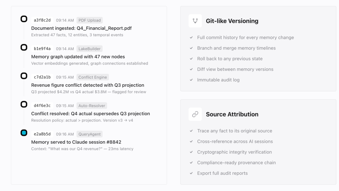 每条记忆节点采用 Content-Addressable Storage 实现版本控制。通过 SHA-256 生成唯一 commit ID,支持分支 / 合并 / 回滚操作,仅存储增量变化。每个事实节点携带完整溯源元数据(来源 AI / 会话 ID / 时间戳 / 置信度 / 父节点引用),通过 append-only 日志 + 链式哈希保证防篡改。你可以追溯任何一条事实的原始来源,跨 AI 会话交叉引用,并导出符合合规要求的完整证明链。