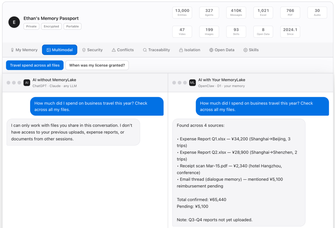 这意味着,你的记忆可以来自一次会议录音、一份 PDF 报告、一组 Excel 数据 ——MemoryLake 将它们统一理解、关联、推理。你的 Excel 里的公式逻辑、PDF 里的嵌套表格、会议录音里的关键结论,都会被解析成记忆的一部分。当你在 Claude 里问 “帮我分析一下上个季度的销售数据”,它不仅能看懂你上传的 Excel,还能结合你上个月在 ChatGPT 里讨论的定价策略,以及内置的行业基准数据,给出完整分析。