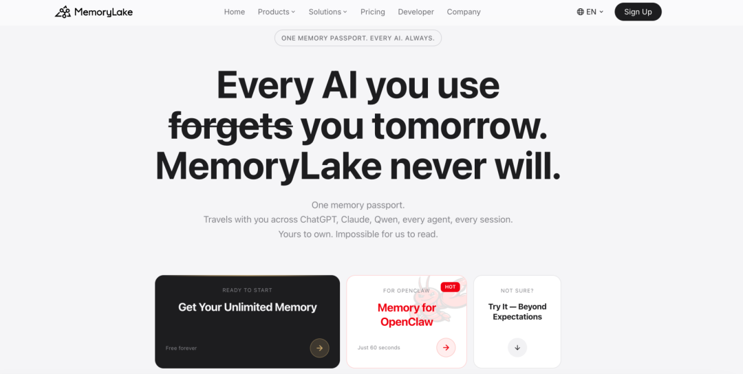 质变科技采用 “一个记忆护照,通行所有 AI” 的方案,解决这一根本性难题。就像护照让你在不同国家无需重新证明身份,MemoryLake 让你的记忆在不同 AI 平台(OpenClaw、ChatGPT、Claude、Qwen 等)之间无缝迁移。