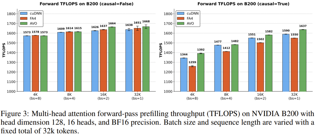 为了验证其有效性,英伟达将 AVO 应用于 NVIDIA Blackwell B200 GPU 上的多头注意力(MHA)内核,并直接与专家优化的 cuDNN 和 FlashAttention-4 内核进行对比。在无需人工干预、长达 7 天的连续自主演化中,智能体探索了超过 500 个优化方向,演化出 40 个内核版本。最终生成的 MHA 内核在 BF16 精度下达到了最高 1668 TFLOPS 的吞吐量,在测试配置中分别超越 cuDNN 高达 3.5%,超越 FlashAttention-4 高达 10.5%。