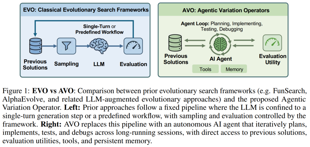 提出代理式变异算子(AVO):这是一类新型的演化变异算子,将智能体从单纯的候选生成器提升为变异算子。智能体通过与环境的迭代交互,自主探索领域知识、实施修改并验证结果。