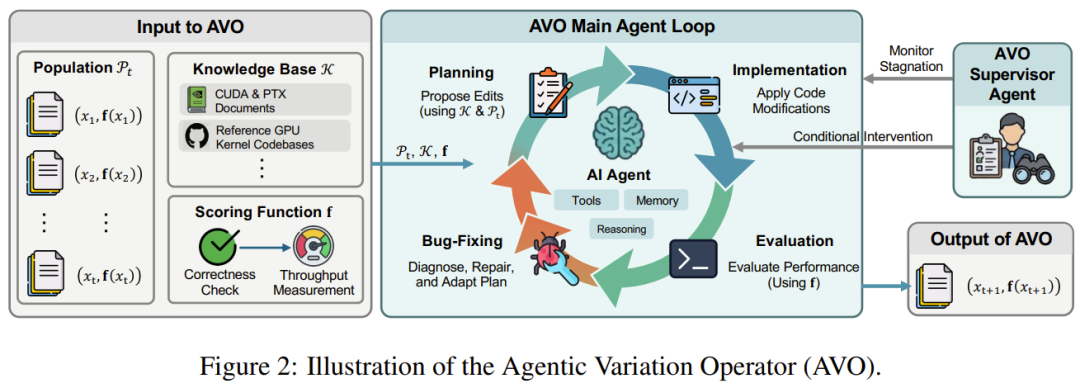AVO 打破了这一局限,将「变异算子」实例化为一个自我驱动的智能体循环。这个 AI 智能体可以自由查阅之前的代码版本记录、调用领域专属的知识库(如 CUDA 编程指南和 PTX 架构文档),并根据执行反馈来主动提出、修复、批判和验证代码修改。