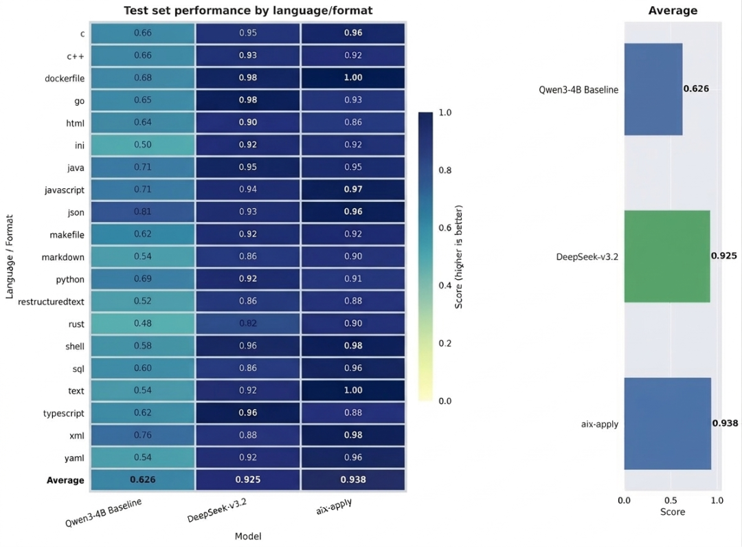 基准测试结果显示,在 20 多种主流编程语言及 Markdown 等多类型文件格式的测试中,aiX-apply-4B 的平均准确率达到 93.8%,超越 Qwen3-4B 基座模型 62.6% 的准确度,甚至高于千亿级大模型 DeepSeek-V3.2。同一任务场景下,aiX-apply 模型算力成本约为 DeepSeek-V3.2 的 5%,推理速度则提升 15 倍,仅需一张消费级显卡即可在企业部署。