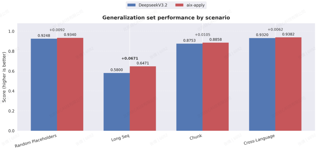 在泛化能力方面,aiX-apply 模型展现出了媲美 DeepSeek V3.2 的准确性和稳定性。无论是面对超长代码文件的精确编辑,还是在训练数据中占比极低甚至未显式出现的编程语言场景下,aiX-apply 模型都保持了良好的范式泛化能力,充分验证了其在真实企业级开发环境中的实用价值。