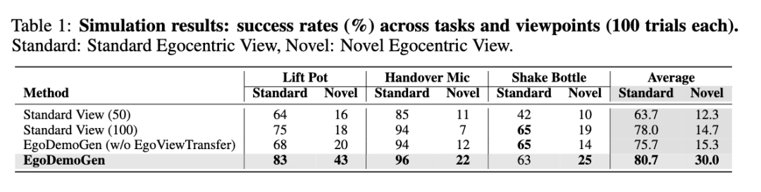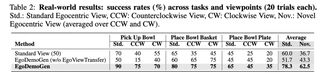 在真实场景的采集中,多摄像头的布置成本高昂,且单视角往往容易面临视觉遮挡的风险。黄岩指出,这项具身跨视角数据增广方法的核心优势在于,能够基于单一视角的演示数据,自动生成多角度且高保真的机器人训练数据。这套方法结合了动作重定向与生成式视频修复技术,通过自监督学习实现,整个过程完全无需人工标注。使用该方法生成的数据进行训练后,模型在已知视角和全新视角下的任务成功率最高分别提升了 18.3% 和 25.8%。