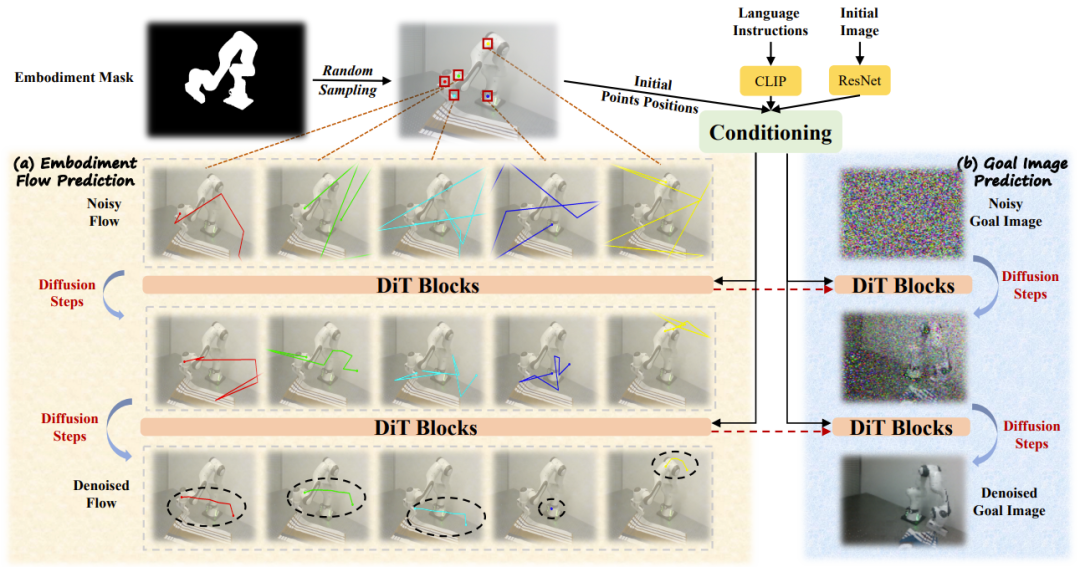 EC-Flow,即以本体(Embodiment)为中心的流预测网络架构。分支(a):本体流的预测分支(b):目标图像的预测,该预测作为辅助任务,用于将流与对象交互和语言指令对齐。arXiv:2507.06224