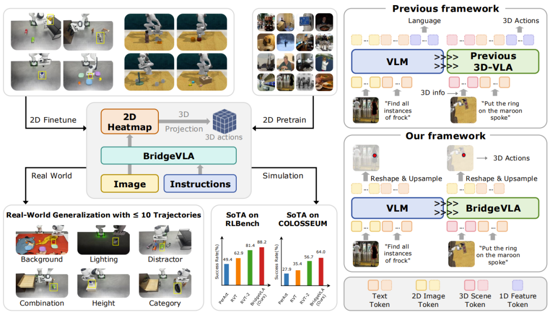 BridgeVLA 是一种新型 3D VLA 模型,它在统一的 2D 图像空间内对齐输入和输出。它使用 2D 热力图在对象定位任务上进行预训练,并在 3D 操作的动作预测任务上进行微调。在仿真和真实世界中的实验结果表明,它能够高效且有效地学习 3D 操作。arXiv:2506.07961