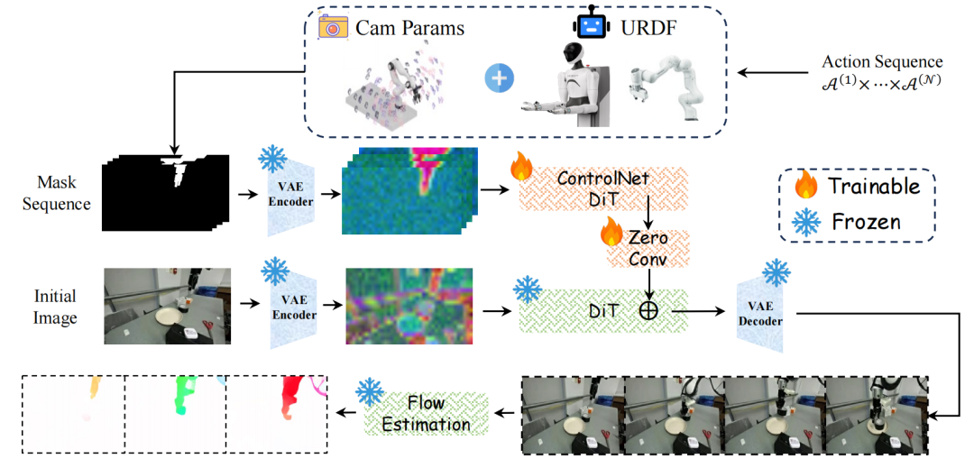BridgeV2W 流程概述。使用 URDF 和相机参数将动作投影到像素空间掩码中。初始图像和掩码序列由 VAE 编码,掩码特征通过 ControlNet 分支注入到 DiT 主干中。该模型生成与动作一致的视频,训练时采用扩散、动态一致性和基于流的目标函数。arXiv:2602.03793