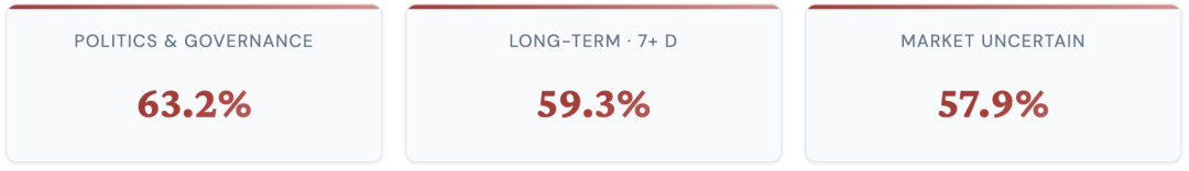 那么,EchoZ 对人类预测者的实际优势有多大?Unipat AI 给出了一组分层对比:将 EchoZ 与人类市场在同一预测批次中的同一问题上进行比较,基于 Brier Score 计算胜率,按领域、预测期限和市场不确定性三个维度展开: