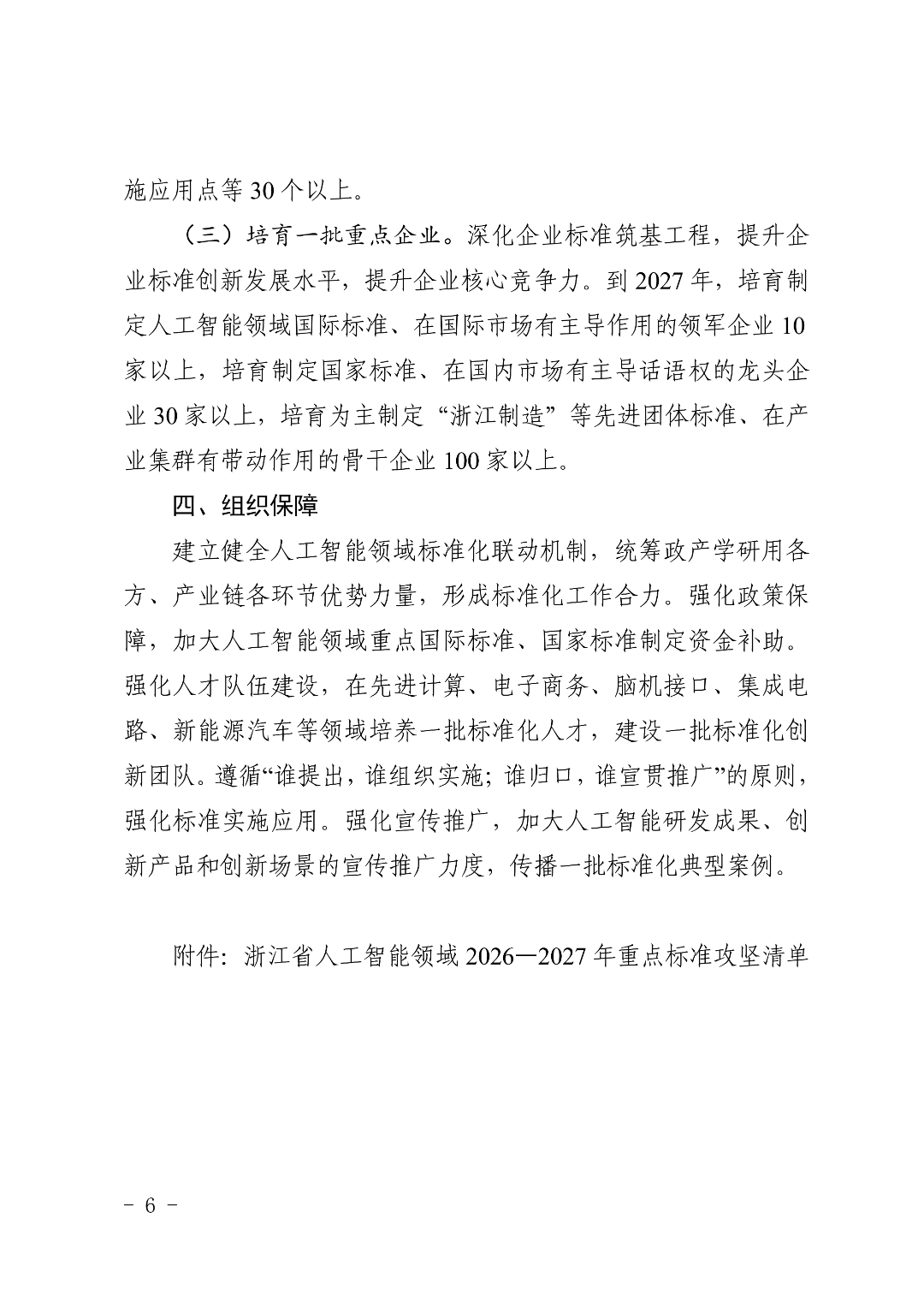 到2027年,培育制定人工智能领域国际标准、在国际市场有主导作用的领军企业10家以上,培育制定国家标准、在国内市场有主导话语权的龙头企业30家以上,培育为主制定“浙江制造”等先进团体标准、在产业集群有带动作用的骨干企业100家以上。
