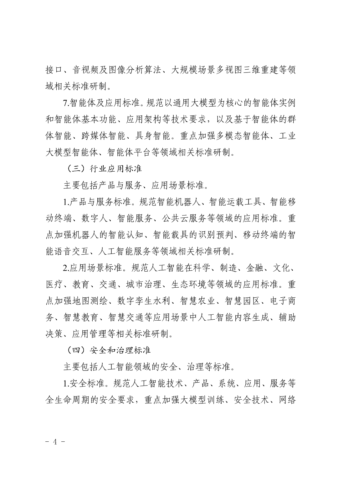 推动AI落地赋能,分为产品与服务、应用场景两类,重点研制智能机器人、智能网联汽车、数字人等产品标准,以及制造、金融、医疗、教育、交通、城市治理等多场景应用标准,让AI融入千行百业。