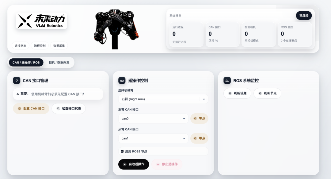● 支持远程遥控、遥操作/VR数据采集,可视化界面,高效积累真实场景数据● 全新机器人操控平台:一键控制、一键连接、一键监控、一键遥操作、一键数据采集