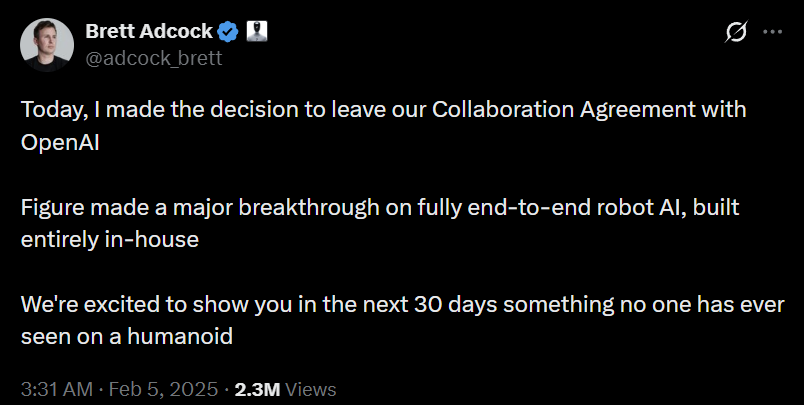 这是Adcock在合作破裂后首次公开接受非投资方播客采访。他直言不讳地表示:“我们从整个关系中几乎没有获得任何价值(We just got like no value out of the whole relationship)。”Adcock回顾称,合作初期对融资确实有帮助,但很快暴露出局限性。他强调,Figure AI内部团队在机器人学习领域“每天都把他们甩几圈(We just found that the team we had internally. We just ran like kind of circles around them like every day)”。合作破裂的直接导火索,是Adcock得知OpenAI计划重启机器人项目:“我们相当于在教你如何做机器人学习……你正在看到我们的进展。我们绝不会再教你们这些东西了(We’re like teaching you how to do robot learning… you’re seeing our progress. There’s no way we’re going to teach you how to do this stuff anymore)。”他认为,继续合作无异于为潜在竞争对手“培训”技术。Adcock还提到,Figure AI已完全转向自主开发的视觉-语言-动作(VLA)模型Helix,这标志着公司从依赖外部LLM转向垂直整合的自有AI体系。此次播客录制正值Figure 03机器人受邀参加白宫科技教育峰会,由第一夫人Melania Trump展示,凸显了Figure AI在分手后的独立发展势头。Adcock的这番表态语气强硬,甚至被外界解读为“解雇”OpenAI,反映出他作为连续创业者(此前创办Archer Aviation)的实用主义风格:机器人AI不是单纯的语言生成,而是必须与物理硬件深度融合的“端到端”系统,外部合作难以满足实时控制与迭代需求。Figure AI与OpenAI的合作始于2024年2月左右。当时,OpenAI不仅投资Figure AI,还提供其最先进的模型,用于Figure 02等早期原型机的自然语言交互、推理和任务规划。这次合作帮助Figure快速完成演示(如对话演示),并在融资和舆论上获益匪浅。2024年3月,双方合作成果初现,Figure机器人展现出较为自然的交互能力,被视为挑战Tesla Optimus等对手的利器。2025年2月4日,Adcock在X上正式宣布终止合作协议(Collaboration Agreement)。他在推文中写道:“今天,我决定离开我们与OpenAI的合作协议。Figure在完全端到端的机器人AI上取得了重大突破,完全由内部构建。我们将在未来30天内向大家展示人形机器人上从未见过的东西。” 随后在另一条推文中他进一步解释:“AI对先进机器人控制至关重要。我们将很快分享更多信息。”并补充称,LLM正变得越来越智能却也越来越商品化,对Figure而言已成为“拼图中最小的部分”,外部AI伙伴关系不仅繁琐,更与公司成功无关。Adcock在后续采访中进一步阐述原因:要在大规模现实世界中解决具身AI,必须实现AI与机器人的垂直整合,“我们不能外包AI,就像不能外包硬件一样”。Figure内部团队在机器人特定训练、强化学习和大模型评估上已远超外部供应商,且合作过程中OpenAI重启自身机器人计划,让Figure担心技术外泄。新闻报道还指出,OpenAI通用LLM更侧重在线文本,而Figure需要针对物理世界的“物理基础”模型,这导致双方技术路线分歧日益明显。这一散伙本质上是具身智能赛道竞争加剧的缩影。通用AI巨头如OpenAI倾向于构建普适大模型,而硬件公司如Figure则需高度定制化的机器人控制系统(高频实时决策、物理交互)。依赖外部模型不仅增加延迟与集成成本,还可能面临数据共享风险——Adcock明确表示不愿“教竞争对手”。同时,2025年前后OpenAI自身硬件探索传闻不断,进一步加速了分手。Figure转向自主Helix模型后,迅速推出Figure 03,并在2026年获得白宫展示机会,估值一度飙升至数百亿美元,证明其自建AI策略在融资和产品落地中取得阶段性成功。但外界也存在质疑声音:也有人认为Adcock的说法存在冲突,或怀疑突破是否足以完全取代OpenAI模型。人形机器人公司正从AI外包转向全栈自研,这或将成为未来竞争的核心壁垒。同时,它也反映出AI生态中“通用 vs 专用”的张力——OpenAI等公司可能加速独立机器人布局,而Figure等硬件玩家则通过垂直整合抢占具身智能先机。免责声明