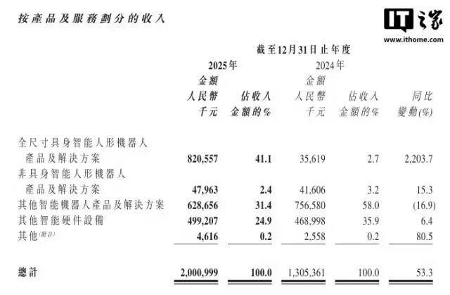 其中,全尺寸具身智能人形机器人产品及解决方案成为最大收入来源,全年贡献收入 8.21 亿元,同比增幅高达 2203.7%。该业务在 2025 年实现销量 1079 台,同比增长超过 358 倍,标志着其从技术验证阶段正式迈入规模化商业应用。
