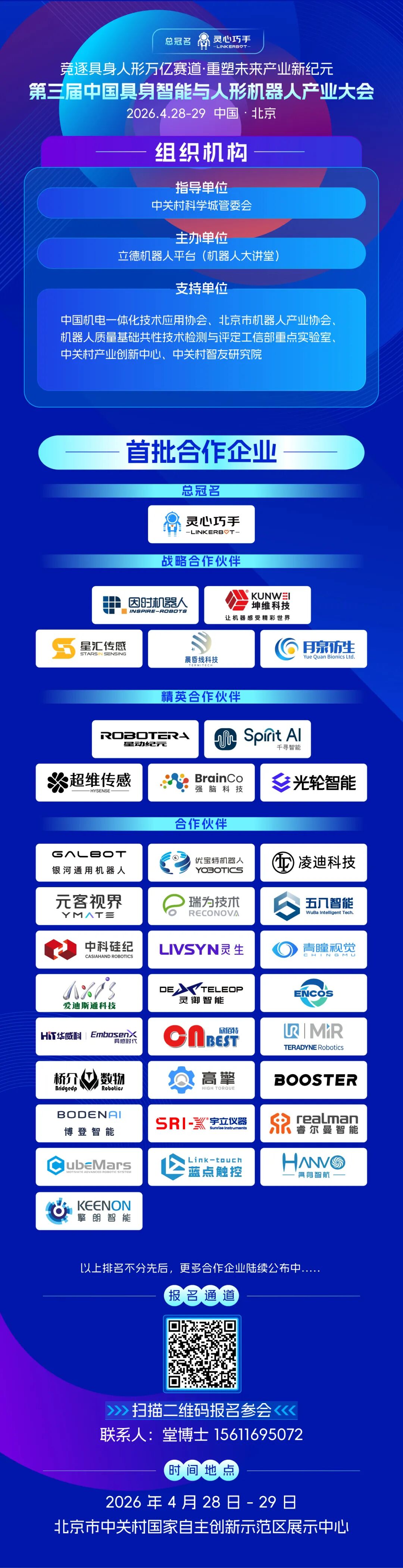 如果您是深耕AI 算法、机械设计、感知系统、运动控制、自动化、控制工程、人工智能、机器人工程等方向的硕博菁英、产业资深从业者、技术骨干,正在寻求在人形机器人、具身智能领域深耕的机会,欢迎扫码报名(人才免费参加本届会议)。