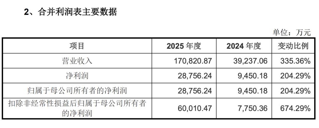 宇树科技披露的招股说明书显示,2025年,宇树科技实现营业收入17.08亿元,同比增长335.36%;实现扣非净利润超6亿元,同比增长674.29%,主要原因为当期产品销量快速增长。