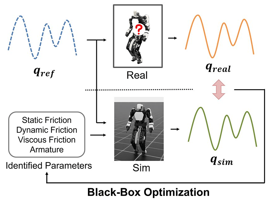 第二套更硬核:Real2Sim 实物反哺仿真。用真机关节电机的实际运行数据,反向校准仿真模型。静摩擦、动摩擦、粘性摩擦、转动惯量,全都通过黑箱优化一一匹配,让虚拟执行器的行为无限贴近真实硬件。