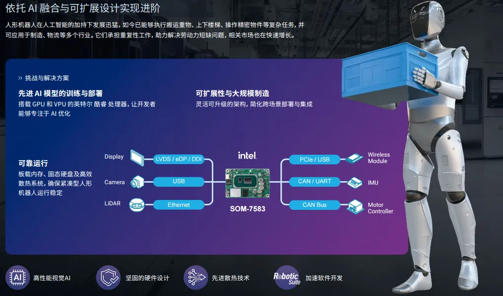 研华立足行业痛点与市场需求,打造了覆盖机器人全生命周期的解决方案体系,以可扩展的硬件架构、开箱即用的开发环境、深度融合的AI 技术、生态化的合作模式,弥合机器人开发与落地的技术鸿沟,实现从边缘计算到智能应用的全链路赋能。