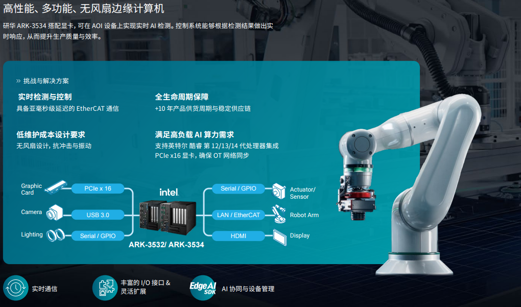 研华聚焦机械臂向智能自主、视觉感知的升级趋势,突破复杂环境下高可靠数据采集、高算力AI 模块集成等技术难点,打造端到端边缘 AI 智能自动化解决方案。方案搭载英特尔酷睿系列处理器,支持 CPU/NPU/GPU 灵活扩展,搭配 EtherCAT/TSN 低延迟实时通信、Preempt RT 实时 Linux 系统,实现多轴机械臂毫秒级同步控制;集成 AI 视觉检测、视觉引导分拣等功能,成功落地焊接自动化、AOI 检测、仓储分拣等场景,让机械臂从 “重复操作” 升级为 “智能决策”,大幅提升工业生产的柔性化与自动化水平。