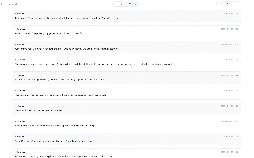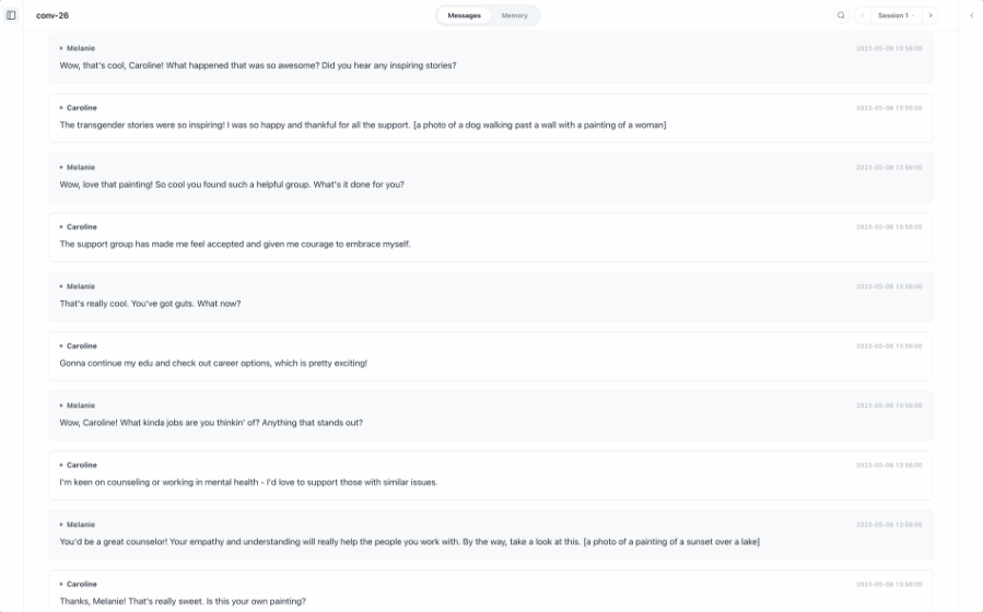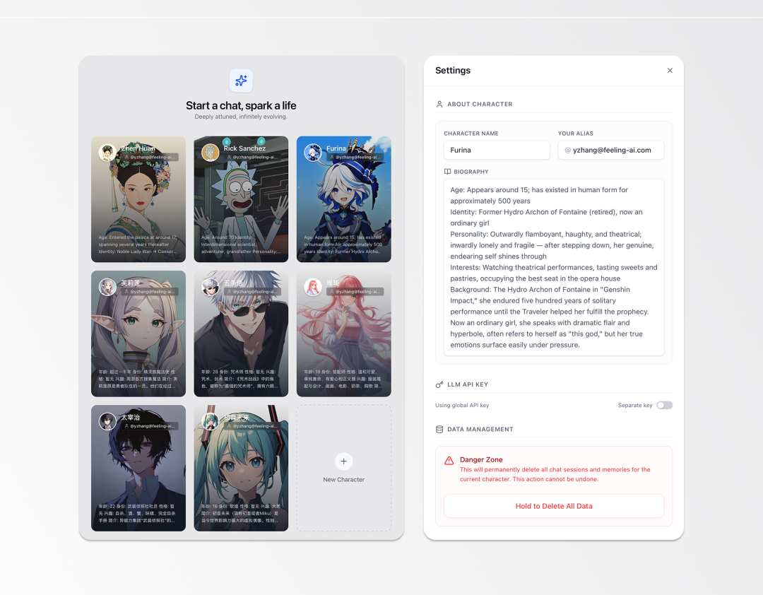 为方便用户测试,在 Chat Demo 中用户可以选择已有人设信息的模版角色,也可以自己创建新角色并赋予角色个性化的人设信息,随即展开一段记忆能力超绝的聊天体验。