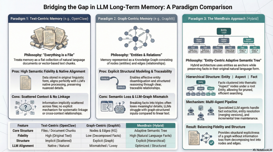 纯文本方案保留了语义保真却缺失显式关联,图结构方案建立了显式关联却牺牲语义保真 ——MemBrain 1.5 尝试从记忆组织拓扑方向上同时回应这两个问题的一小步。