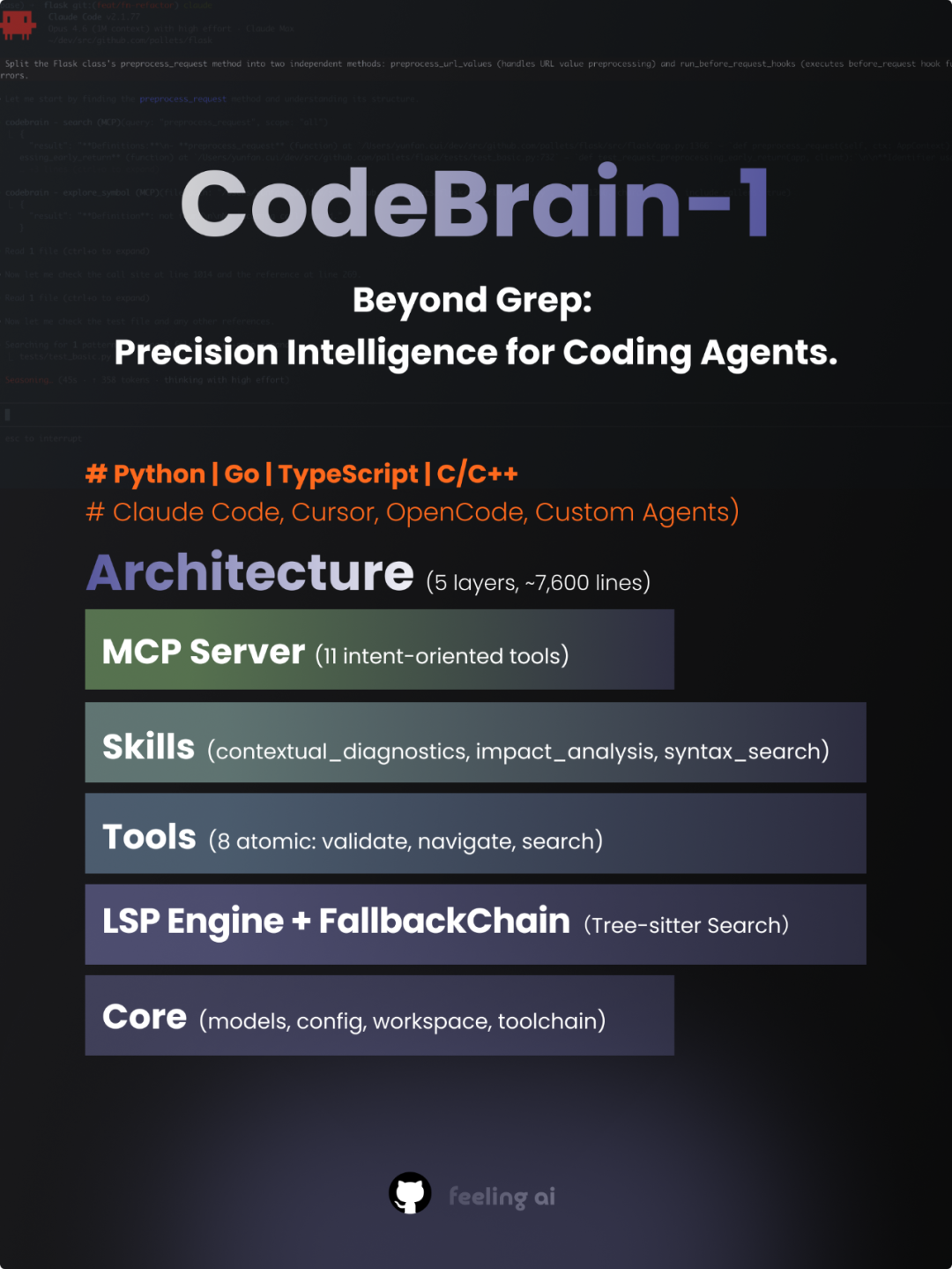 Agent 的大脑在加速迭代中始终缺乏一套能看穿代码逻辑的 “视觉神经”。针对这一瓶颈,CodeBrain 给出了一套极具工程美学的解决方案。它不是一个简单的 Prompt 集合,而是一个分为 5 层、约 7,600 行代码的 Python 库 + MCP 服务器,将 LSP 语言服务器和 tree-sitter 语法封装为 11 个面向意图的工具,任何 Agent 均可调用,并赋予 Agent 架构师级的逻辑直觉。其 5 层可堪为工业级架构包含:
