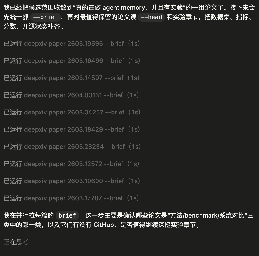 如果说前面这些能力描述的是 DeepXiv 能做什么,那么更能体现它价值的,其实是它如何在一次真实任务中把这些能力串起来。